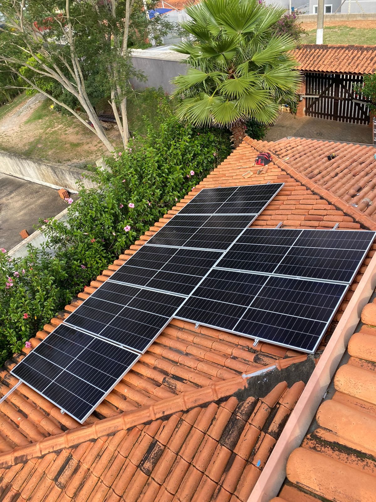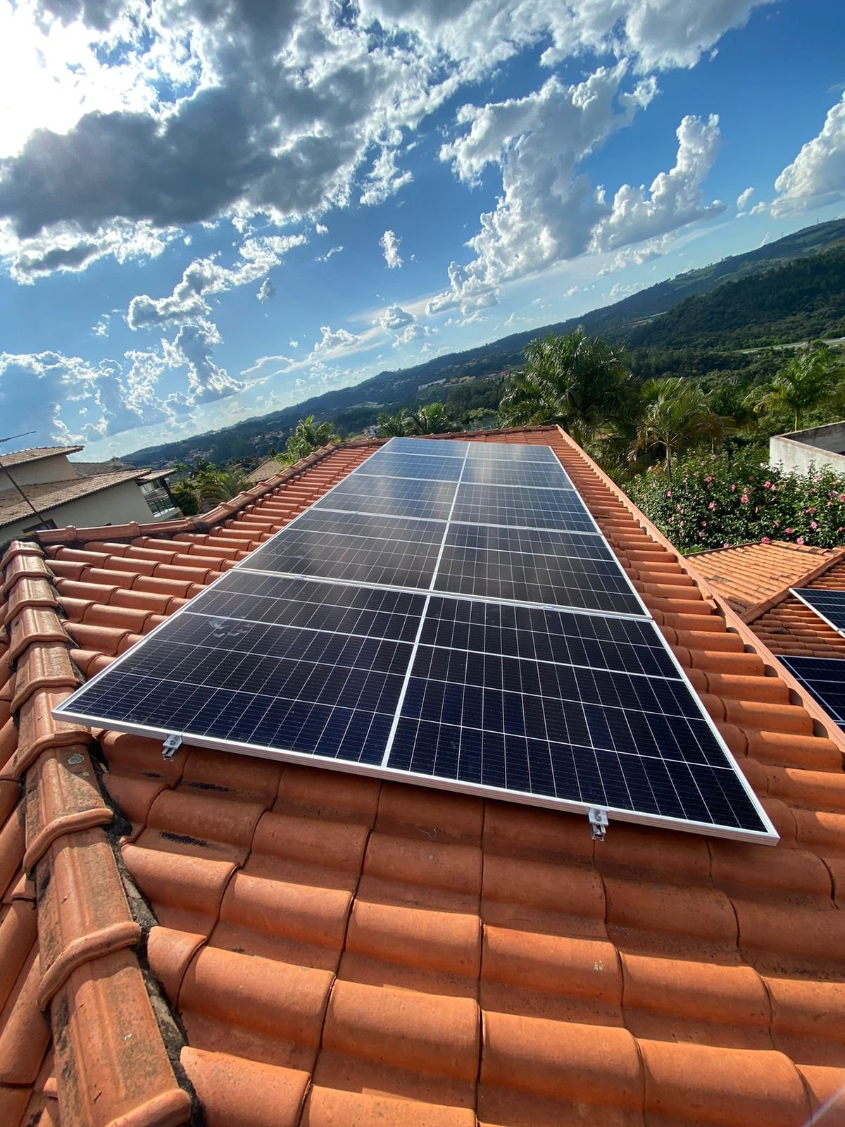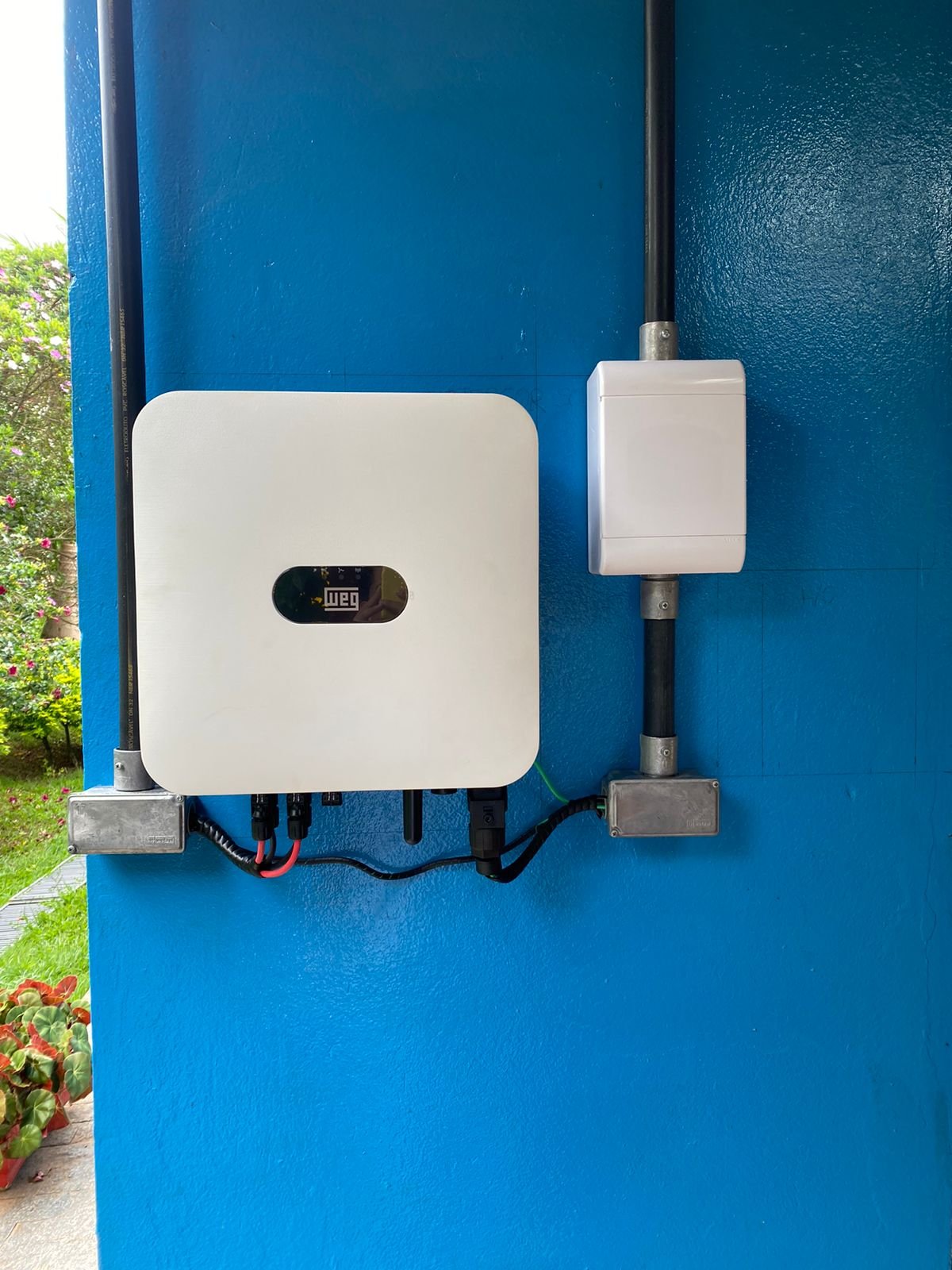 Microgerador Fotovoltaico de 6,12 kWp (12 módulos fotovoltaicos Trina Solar de 510 Wp e 1 inversor WEG/Huawei de 5KW de potência nominal). Compõem o kit WEG do gerador solar fotovoltaico a estrutura de suporte para instalação em telhado cerâmico, os cabos elétricos de corrente contínua com proteção UV e demais componentes.